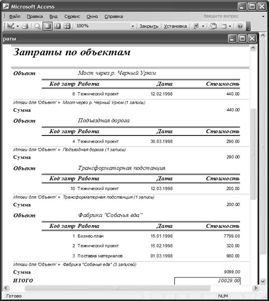 На рис. 9.4 показан отчет Затраты по объектам за первый квартал 1998 года. В этот отчет включены данные из запроса Затраты за период. Отчет получен с помощью мастера отчетов. В окне базы данных надо выбрать тип объекта – Отчеты и нажать кнопку Создать отчет с помощью мастера, далее выбрать запрос Затраты за период – в качестве источника данных. После этого, делая выбор в предлагаемых диалогах, остается уточнить перечень полей, включаемых в отчет, вариант группировки и сортировки записей, вариант вывода итоговых строк и ориентацию страниц. Отчет в сочетании с запросом позволяет отобрать из базы данных требуемую информацию, сгруппировать итоговые записи (на рис. 9.4 группировка выполнена по объектам) и автоматически получить итоговые строки. Отчет можно напечатать, выбрав пункт меню Сервис/Связи с Office/Публикация в Microsoft Office Word. Наконец, в отчет нетрудно внести редакционные изменения, но не в режиме создания с помощью мастера отчетов, а в режиме конструктора. Так в нашем примере слово Sum, которое процедура Мастер отчетов вставляет в итоговые строки, заменено на слово Сумма. Вообще в режиме конструктора можно изменять и таблицы, и формы, и запросы, и отчеты.