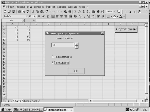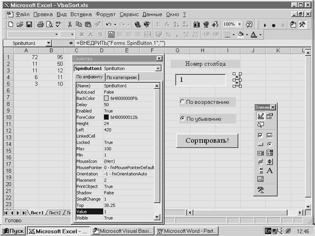Рассмотрим создание интерфейса пользователя на простом примере. Пусть на листе Excel размещены столбцы чисел. Требуется, чтобы проектируемое приложение позволяло пользователю выбрать столбец для сортировки, выбрать вариант сортировки (по возрастанию или по убыванию) и, наконец, выполнить саму сортировку. Из поставленной задачи следует, что наше приложение надо “оснастить” элементами управления (см. подраздел 2.2) для выбора номера столбца (поле во взаимосвязи со счетчиком), варианта сортировки (переключатели) и для запуска событийной процедуры сортировки (командная кнопка). С помощью VBA эти элементы управления можно разместить или прямо на листе Excel (рис. 10.1), или же на диалоговой форме, которая будет появляться в диалоговом окне (поверх листа Excel) при нажатии на кнопку Сортировать – кнопку целесообразно оставить на листе Excel и в этом случае. Рассмотрим первый вариант.