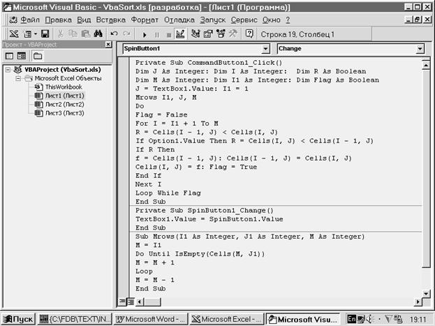 Вторая событийная процедура в нашем примере связывается с командной кнопкой CommandButton1, имеющей заголовок Сортировать. При двойном щелчке по этой кнопке в окне редактора VBA автоматически возникнет пустая процедура: