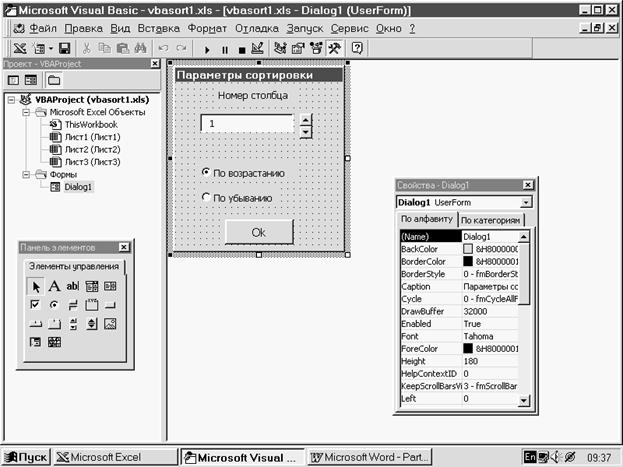 Приведенный пример показывает, что создание интерфейса приложения, которое было трудной работой в более ранних системах программирования, в современных средах визуального программирования выполняется моментально – и это можно утверждать без преувеличений. Но поясним еще вариант размещения элементов управления не на листе Excel, а на отдельной форме. В этом варианте на лист Excel поместим только кнопку CommandButton1 с тем же заголовком Сортировать, а остальные элементы управления и дополнительно кнопку Ok поместим на диалоговую форму с именем Dialog1 и заголовком Параметры сортировки. Для создания этой формы надо переключиться в окно Visual Basic и с помощью кнопки на панели инструментов или через пункт меню Вставка/UserForm создать пустую форму. Она появится в окне Visual Basic. При щелчке мышью по форме появляется также окно Панель элементов, содержащее палитру элементов управления. Теперь остается с помощью кнопки на панели инструментов раскрыть в окне Visual Basic еще окно свойств, установить свойства формы и разместить на ней требуемые нам элементы управления точно так же, как это было сделано на листе Excel (Рис. 10.3). Такой подход почти освободит лист Excel от элементов управления, но потребует дополни