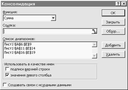 Рис. 8.8. Диалоговое окно, открывающееся при выборе пункта меню Данные/Консолидация