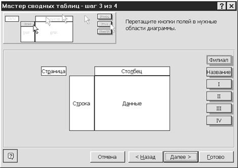 3) создать макет сводной таблицы, используя известные поля; в нашем примере надо переместить мышью кнопку поля Филиал в область Страница (Рис. 8.9), кнопку поля Наименование – в область Строка, а кнопки I, II, III, IV – в область Данные; нажать кнопку Далее;