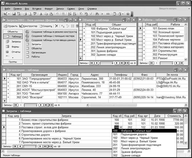 Рис. 9.1. Рабочее окно СУБД Access с открытыми таблицами БД «Затраты»