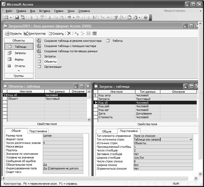 Рис. 9.2. Создание таблиц Объекты и Затраты