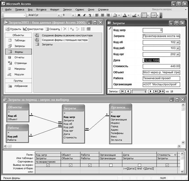 Для создания схемы данных можно воспользоваться пунктом меню Сервис/Схема данных или соответствующей кнопкой на панели инструментов. В появившемся диалоговом окне надо выбрать таблицы, включаемые в схему. После этого появится схематическое изображение таблиц в виде прямоугольников, содержащих список полей (см. рис. 9.3). После этого остается с помощью мыши соединить поля Код об, Код раб, Код орг таблицы Затраты с ключевыми полями других таблиц – на схеме появятся стрелки с указанием типа связи (см. подраздел 9.2). Если по стрелке щелкнуть правой клавишей мыши, то всплывет меню, позволяющее изменить свойства связи: например, можно, выбрав метод Изменить связь, установить в очередном диалоговом окне флажок Обеспечение целостности данных (см. подраздел 9.2). На рис. 9.3 схема данных изображена не в момент ее создания, а при создании запроса – схема данных используется всегда, когда данные берутся из нескольких связанных таблиц.