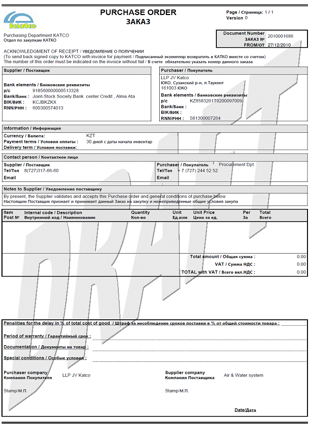 Приложение 1 к Договору № : Заказ на закупку | Annex 1 to Agreement No.: Purchase order |