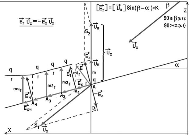 Выберем точку Ах на дне бассейна, которая расположена на стыке зон накопления осадков типа q и типа r, рис. 3.1. Теперь величина Ux становится конкретным вектором Ūх и его начало может быть совмещено с точкой Ах. В соотношении (3.5) все величины, если они относятся к точке Ах, становятся векторными и приобретают вполне конкретный смысл. Скорость накопления толщины осадка в этой точке есть вектор Ēz, его значение задаёт вектор Ūх со своим углом наклона к горизонту - β, и уголом наклона дна бассейна - α: