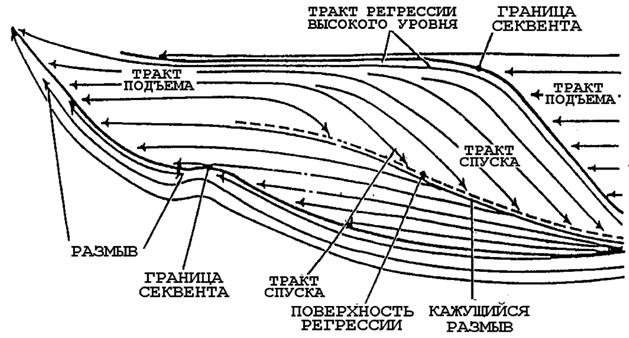 Переход к регрессии высокого уровня, сначала относительно плавный, ведёт в дальнейшем к формированию ещё одной, помимо границ секвенции, поверхности угловых несогласий, так называемой “down lap surface”, в нашей терминологии – «поверхности регрессии», которая не содержит фактических размывов. Она обычно уверенно фиксируется на временных разрезах метода ОГТ, хотя граничащими на всём её протяжении становятся различные по своему литологическому облику породы. Такая поверхность не может быть горизонтальной, но она изохронна, так как фиксирует форму дна бассейна во время смены режима стабилизации на «down lap». Перекрывающий комплекс слоёв при этом резко меняет углы наклона, от почти горизонтальных к круто падающим, при плавном переходе к этапу обычной регрессии. Проницаемые породы несогласно налегают на глинистую пачку предыдущей трансгрессии, задавая ещё одну область локализации клиноформ. При завершении этапа формируется верхняя граница секвента. Она тоже имеет S - образную форму, и секвент становится «геологической чечевицей» Головкинского – рис. 3.2.