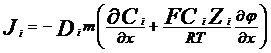 Здесь Ji - диффузионный поток иона ”i”, катиона (k) и аниона (a), Zi их заряд, Ci – концентрация. Для раствора в свободных порах выполняется условие электронейтральности и уравнение (4.1) принимает вид уравнения диффузии нейтральной примеси, с той разницей, что вместо коэффициентов диффузии Di в нём будет участвовать эффективный коэффициент диффузии - D [16]: