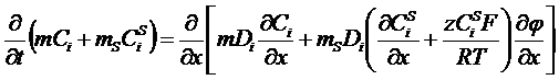 Но процесс идёт в электрически активной среде, поскольку поверхность 2:1 слоёв смектита несёт избыточный отрицательный заряд. В системе, имеющей как относительно свободный объём пор, так и межслоевое пространство типа смектита, уравнения (4.1) нужно дополнить законом диффузии в присутствии зарядов Нернста-Эйнштейна и привести (4.1) и (4.2) к конечному виду [44]: