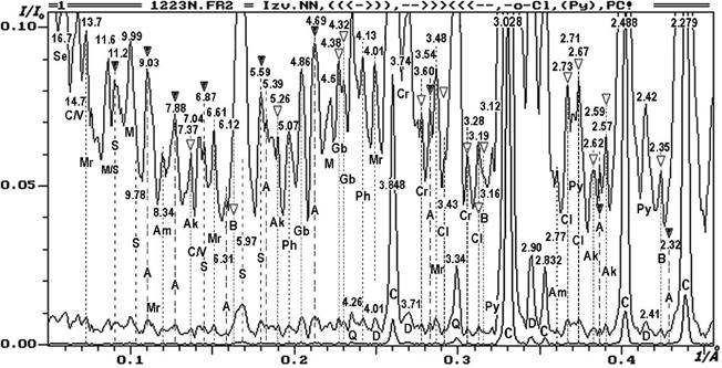Сульфиды в карбонатных разрезах чаще представлены пиритом, который может быть не связан с нефтью, и создавать мономинеральные выделения. В этом случае он образует на дифрактограмме узкие рефлексы с нормальным распределением интенсивностей. Но часто пирит является тонкодисперсным, не вполне кристаллическим, его диагностика может быть только рентгеногра-фической. При этом ширина и амплитуда отражения 200 много меньше, чем для 111. Тогда пирит является индикатором биогенной сульфат - редукции, максимальной в пределах зоны водо-нефтяных контактов, включая древние, либо на иных интервалах, где в какое-то время вода и нефть находились в соизмеримых количествах. Его дисперсность указывает на высокую скорость образования сероводорода и наличие восстановительного потенциала Eh.