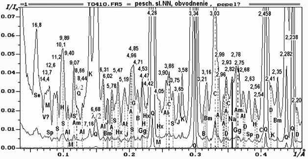 Полный список минералов, установленных методом рентгенографии с необходимой для генетической интерпретации надёжностью превышает 50. В составе пород установлено несколько групп кристаллических фаз, связанных пространственно и генетически. За исключением кальцита, иногда доломита, кварца и тех минералов, которые появляются только на заглинизированных участках разрезов, их концентрация всегда много меньше 1%, т. е. они сами по себе не могут влиять на процессы фильтрации в коллекторе, но позволяют фиксировать происходившие в нём явления. Главным первичным минералом известняков всегда является кальцит. Он может быть как первичным так и вторичным, образованным при снижении в поровом растворе парциального давления СО2. Часто наличие вторичного кальцита проявляется в небольшом смещении дифракционных максимумов, которое вызывается повышенным содержанием изоморфной примеси Mg2+ или Mn2+. В последнем случае часто фиксируются и самостоятельные рефлексы родохрозита. Вторичный доломит может быть основным минералом, но чаще встречается как малая примесь, и обычно приближается метрикой решётки к анкериту Ca(Mg, Fe)(СО3)2. Кроме того, во многих образцах присутствует и сидерит FeСО3, который устойчив к биохимическому разложению. Он в условиях карбонатной седиментации явно вторичный, образуется за счёт фиксации Fe2+ в восстановительных условиях при перекристаллизации кальцита, когда Ca2+ « Fe2+ замещение выходит за рамки изоморфизма. Свидетельством тому служат закономерные отклонения интенсивностей и положений рефлексов сидерита от их эталонных значений.