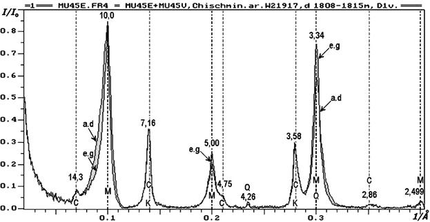 промышленность" href="/text/category/himicheskaya_i_neftehimicheskaya_promishlennostmz/" rel="bookmark">нефтепромысловых объектов фиксируются метасоматические преобразования глинистой компоненты, связанные с биокосными явлениями. Идёт аградация слоистых силикатов, сохранивших в деградации основные диоктаэдрические фрагменты своих структур, в метастабильные смешанослойные фазы путём трансформационного кристаллогенеза. Внедрение сеток AlО(OH) между 2:1 слоями любого состава формирует фазы типа тосудита и судоит-иллита [35]. На рис. 4.3 приведены наложенные друг а друга спектры дифракции сухого a. d и насыщенного этиленгликолем e. g образца покрышки в девонской толще вне зоны нефтенакопления, а на рис. 4.4 – покрышки над залежью нефти в разрезе башкирского яруса, где появляются фазы тосудита и иллит - судоита, (или иллит – вермикулита) типичные для покрышек продуктивных пластов.