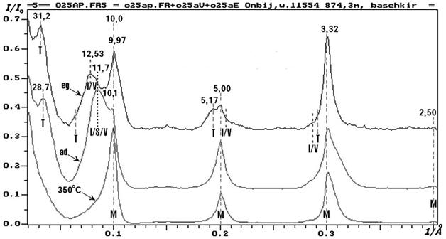 Рис. 5.4. Обозначения: М – слюда, Т – тосудит, I/S/V - иллит/ смектит/ вермикулит смешанослойные фазы, I/V - фаза иллит/ вермикулит без вклада от иллит/ смектита.