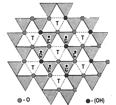 Из трёхвалентных катионов большой интерес для нас представляет Al. Являясь амфотером, он в кислой среде выступает как Al3+, а при щелочных рН создаёт комплекс Al(OH)21-, который в межслоевых промежутках смектита может формировать соединения переменного состава с разным количеством групп (OH) и молекул воды. В предельном случае возникает сетка октаэдров состава Al(OH)3 , отвечающая по структуре минералу гиббситу.