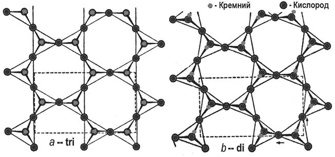 Вторая сетка формируется тетраэдрами [SiO4] у которых три вершины обобществлены с образованием мотива [Si4O10] 2∞, где до ¼ тетраэдров, но не соседних, могут замещаться на Al3+ или частично на Fe3+. Кислороды общих вершин тетраэдров именуют базальными, а кислород, который принадлежит обеим сеткам в слое, - апикальным. Возможны три варианта сочленения тетраэдрических сеток с октаэдрическими. В общих вершинах располагаются кислороды, а оставшаяся ⅓ вершин октаэдров представлена одновалентными анионами – (OH) -1 или F -1 [11]. В идеальных триоктаэдрических структурах симметрия сеток тетраэдров почти гексагональная, в диоктаэдрических она снижается до псевдо тригональной, и возникает гафрировка сеток (рис. П.2).