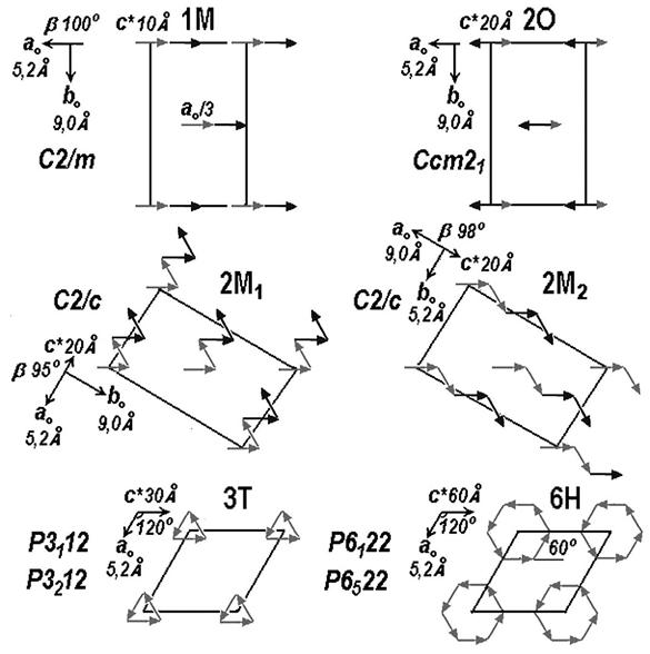 Рис. П.3 Политипы слюд с указанием их пространственных групп и периодов идентичности по оси с*. Стрелки одной яркости дают поворот 2:1 слоёв в пределах одной элементарной ячейки.