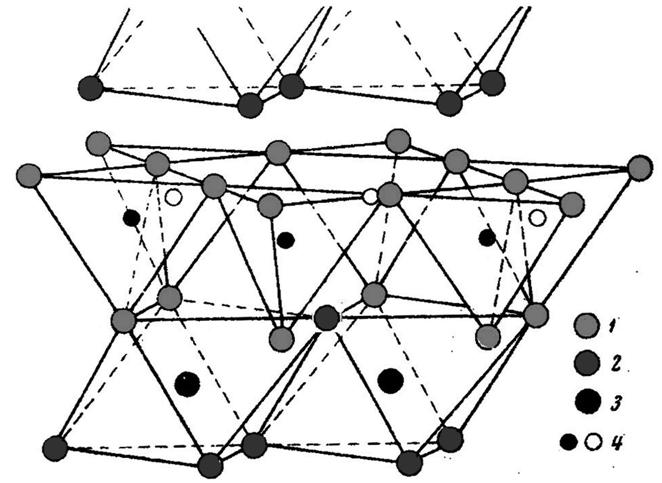 Рис. П.8 Структура триоктаэдрического хлорита. Обозначения ионов: 1 – кремний, 2 – кислород, 3 – гидроксил «бруситоподобной» сетки октаэдров, 4 – магний.