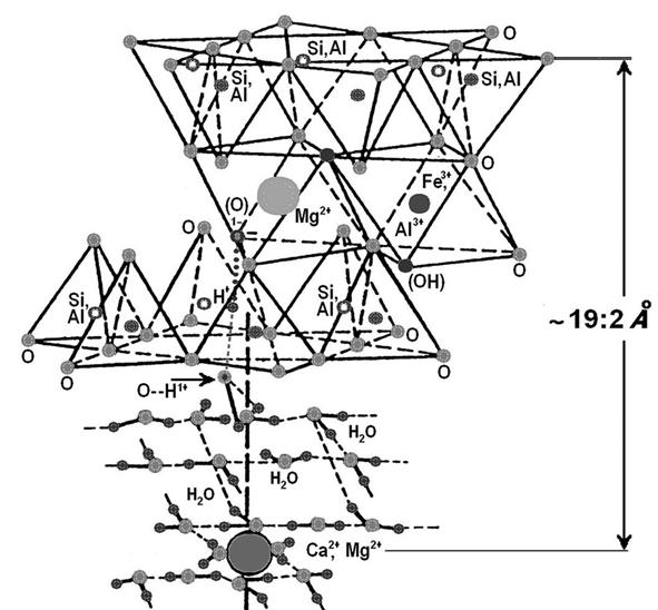 Особую роль в кристаллохимии смектита играет Н2О, являющаяся частью его структуры. При относительном давлении паров Р/Р0 = 0,92 завершается, при любом межслоевом катионе, формирование двух мономолекулярных Н2О сеток на всех базальных поверхностях слоёв. На формульную единицу при этом приходится 13 молекул Н2О. Одна из них образует гидроксильную связь донорно-акцепторного типа между протонами и свободными кислородами октаэдрической сетки, которая несёт избыточный отрицательный заряд. Эта сильно поляризованная молекула с наибольшей прочностью связи удаляется при температуре свыше 300°С. Часть остальных молекул воды формирует координационные связи с межслоевыми катионами, которые зависят от их типа и влажности внешней среды. Оставшиеся молекулы Н2О создают путём межмолекулярных водородных связей сплошные сетки между слоями [47]. Структуру смектита даёт рис. П.5, кристаллохимическая формула имеет вид: