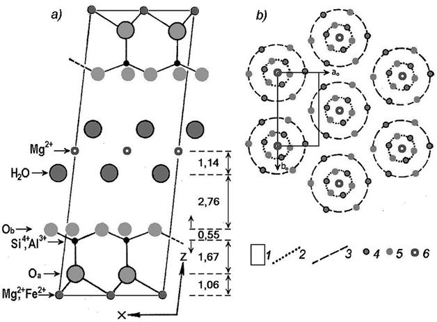 Рис. П.6 а) структура элементарной ячейки вермикулита в проекции на плоскость 010, и b) межслоевого промежутка на плоскость 001. Обозначения: 1 – границы ячейки, 2 -- первая и 3-- вторая координационная сферы из «верхних» и «нижних» молекул воды, 6 – обменный двухвалентный катион. Высоты сеток приведены в Å.