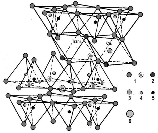 Рис. 3.7 Идеализированная структура диоктаэдрической слюды с транс - октаэдрами вакантными. Обозначения: 1 – кислород, 2 – гидроксил октаэдров, 3 – алюминий октаэдров, 4 – алюминий тетраэдров, 5 –кремний тетраэдров, 6 – межслоевой калий