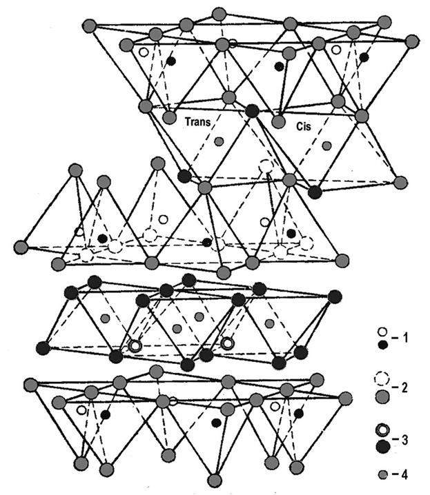 Рис. П.4. Структура слоя каолинита. Обозначения: 1 – кислороды тетраэдров, 2 – гидроксилы октаэдрических сеток, 3 – алюминий, 4 – кремний в ближних и дальних (пустой) тетраэдрах.
