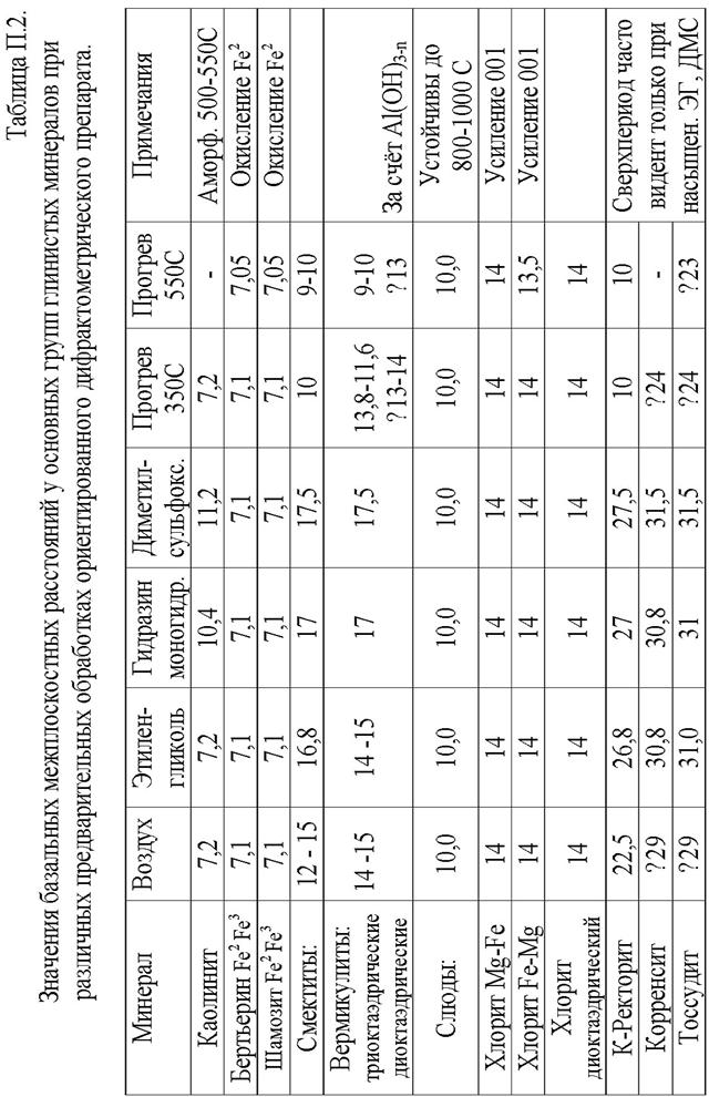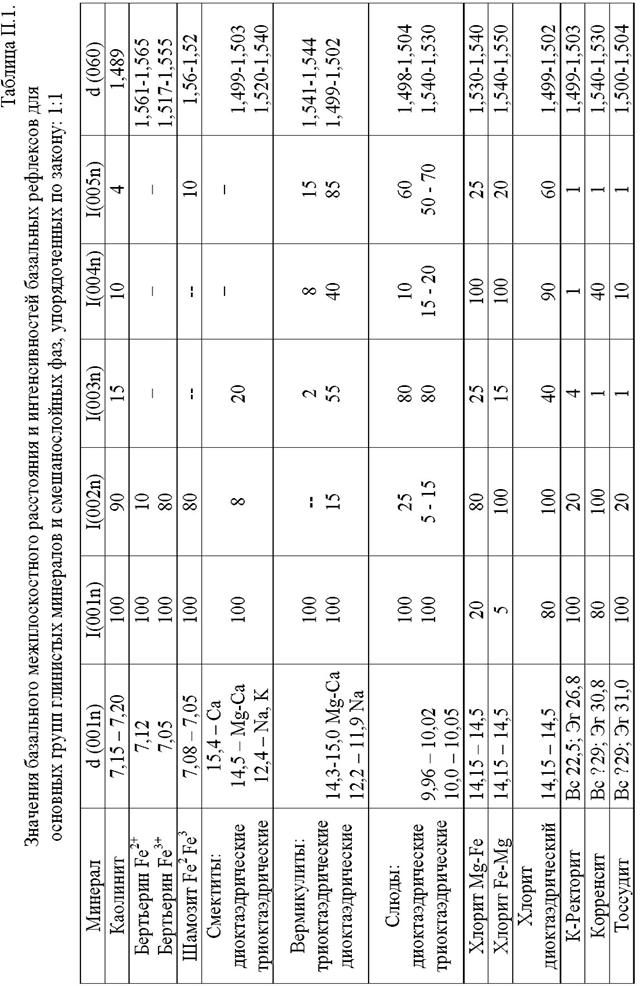 Палыгорскит и сепиолит, обладая слоисто-ленточной структурой и почти не меняя метрики своей решетки, как при насыщении, так и прокаливании, надежно диагностируются по рефлексам общего положения. Приведённые в Таблице П1 значения d001 для основных глинистых минералов при различных обработках препарата, а так же интенсивности их 00L рефлексов, Таблица П2, позволяют вести диагностику глинистых минералов с точностью до группы. Для установления принадлежности объекта к определённому минеральному виду и определения его политипии необходимы рефлексы общего положения типа 11L-02L, 13L-20L и 060, полученные методами, описанными в главе 1.