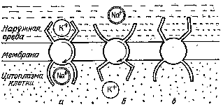 калия снаружи и ион натрия внутри клетки; б - белковая молекула,