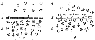 Возникновение разности потенциалов на полупроницаемой мембране: А - раствор с низкой концентрацией ионов (наружная среда), Б - полупроницаемая мембрана, пропускающая положительные ионы калин, но не пропускающая анионы, В - раствор с высокой концентрацией ионов внутри клетки, а - Исходное состояние до возникновения разности потенциалов: внутри ионов калия (черные точки) много, снаружи (раствор А) - мало, но и там, и там заряды ионов калия компенсируются отрицательными зарядами анионов, б - Конечное состояние динамического равновесия: часть ионов калия прониклачерез полупроницаемую мембрану, снаружи положительных зарядов стало больше, чем отрицательных, внутри - наоборот. Анионы тянут "убежавшие" ионы калия назад, в результате потоки ионов калия через мембрану в ту и в другую сторону становятся равными. Возник нернстовский потенциал.
