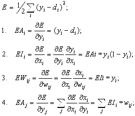 Мы знаем, что должно быть на выходе и постепенно вычисляем вход от слоя к слою по цепочке формул : При этом после определения (2) в каждом слое можно вычислить по формуле (3) dw и далее w по формуле: w = w + dw. Реализуется как бы метод градиента.