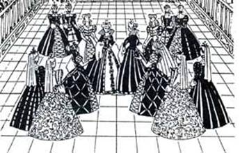 На рисунке – фрагмент гравюры XVI века «Кадриль перед королевой». Женщина в центре, стоящая лицом к зрителю, - это, конечно, королева. Рядом с ней – первая придворная дама. Она в центре воображаемого квадрата, по диагоналям которого стоят симметричные группы других дам. Красивая гравюра! По одному изображению трудно понять, что происходит, но название гравюры нам подсказывает: женщины танцуют кадриль. Их симметричное расположение настолько спокойное, застывшее, что кажется, будто дамы собрались постоять так целую вечность.