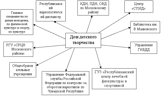 МОУ ДОД «Дом детского творчества» взаимодействует со всеми субъектами профилактики правонарушений: образовательными учреждениями, структурными подразделениями администрации Московского района (специалистами по физической культуре и спорту, по делам молодежи, культуре), КДНиЗП, ПДН, Московскому району, медицинскими учреждениями, учреждениями культуры и др.