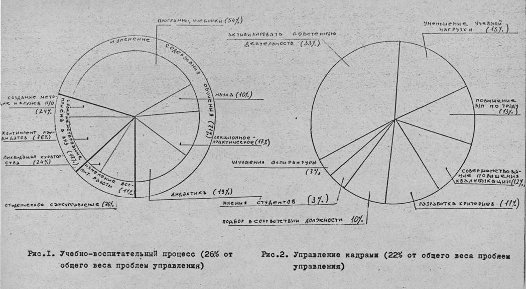 Сюда, прежде всего, можно отнести оценку профессионального уровня преподавателей и научных сотрудников, которые только 4% руководителей был определен как острая проблема. Еще благодушное высказывания 27% членов ректоратов и трети деканов, считающих, что в профессиональной подготовке преподавателей нет проблем. Примерно также били оценены вопросы стиля работы ректората, парткoмa, состояния гласности и социально-психологического климата в вузе (всего 3 – 11% руководителей оценивают их как острые проблемы).