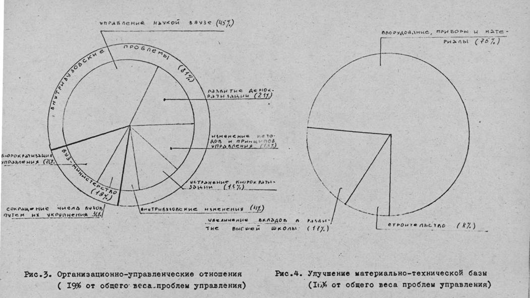 – "Максимально обновить аппарат министерства. Изменить структуру Минвуза. Вместо функциональных управлений создать управление по руководству: 1) набором студентов; 2) подготовкой студентов; 3) распределением и использованием специалистов" (Харьков, с/х институт);