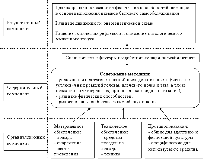 В соответствии с поставленной целью была выдвинута гипотеза исследования, построенная на предположении, что методика физической реабилитации инвалидов со спастической формой церебрального паралича в ранней и средней резидуальной стадии в возрасте 3–7 лет средствами иппотерапии, разработанная на основе закономерностей развития движений человека в онтогенезе и установленных связей между физической и социально-бытовой реабилитацией инвалидов со спастической формой ДЦП, будет способствовать более эффективному развитию физических способностей реабилитантов за счет: