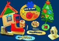 Познают мир "руками" не только крохотные малыши - игрушки, которые требуют работы кисти, пальцев полезны и детям постарше. Мария Монтессори почти сто лет назад давала своим детям кусочки кожи с дырками и шнурки - и руки развивает, и сосредотачиваться учит, и в жизни пригодится. Нам, в отличие от Монтессори, не придется сидеть с ножницами и тряпочками. Можно просто купить "игру-шнуровку" - набор из разноцветных шнурков и башмака, пуговицы, "куска сыра" или какой-нибудь еще деревянной штуки с дырками. Иногда к ним прилагается еще и деревянная иголка. Представляете, как приятно девочке заполучить запретные иголку с ниткой и стать "совсем как мама".