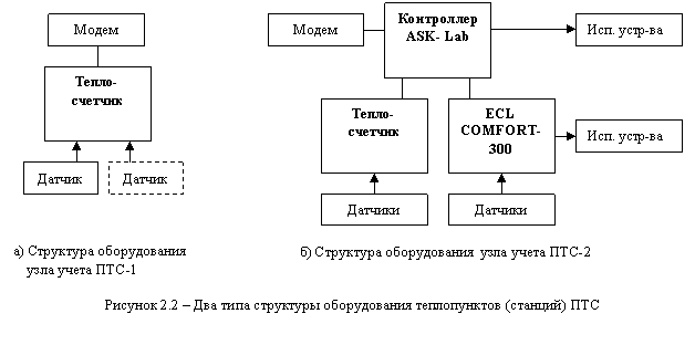 Структура системы представлена на рисунках 2.1–2.2. В системе имеется возможность использования четырех типов АРМов. В настоящее время объекты ПТС можно разделить на две группы по признаку наличия автономного контура регулирования. Автономное регулирование тепловым режимом ряда станций осуществляется контроллером ECL Comfort 300 (DANFOSS). Верхний уровень системы включает в себя две подсистемы: чисто информационную ПТС-1 и информационно-управляющую ПТС-2, обслуживающую станции с контуром автономного регулирования.