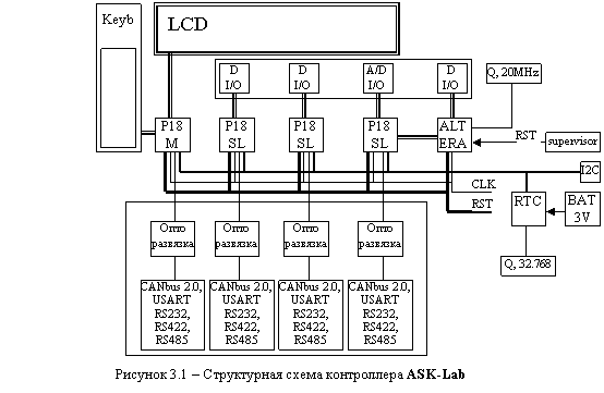Выше упоминалось, что контроллер ASK-Lab построен на базе 4-х микропроцессоров PIC18F458. На этих микропроцессорах построена внутриплатная одномастерная сеть на базе интерфейса I2С. Мастером сети является один из микропроцессоров, все остальные работают по отношению к мастеру одинаково как периферия. Каждый микропроцессор имеет набор стандартных аппаратно реализованных коммуникационных интерфейсов с оптической развязкой. Кроме стандартных коммуникационных интерфейсов, контроллер имеет внешний разъем, на который выведены порты с периферийных микропроцессоров. Эти особенности аппаратной составляющей контроллера необходимо учитывать при разработке ПО. Структурная схема контроллера ASK-Lab приведена на рисунке 3.1.
