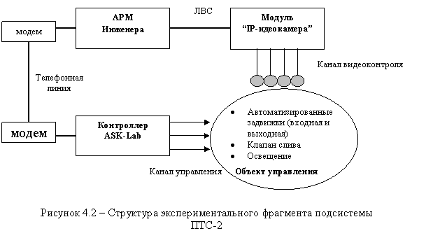 В рамках первого этапа реализации проекта в первом полугодии 2005 г. проводились инженерные эксперименты для проверки ряда новых подходов по обеспечению надежности управляющей подсистемы ПТС-2 в режимах ручного управления исполнительными механизмами с ДПС (с АРМ инженера). Для экспериментов была применена система видео контроля (высокоуровневое ПО для этой системы разработано в рамках дипломной работы), которая находился в одном здании с центральным ДПС. Структурная схема эксперимента представлена на рисунке 4.2.