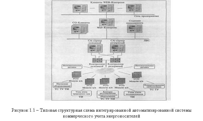 В общем случае автоматизированная система учета энергоресурсов на базе ПТК серии "Круг-2000" представляет собой многоуровневую систему распределенного типа, интегрированную в сеть предприятия. Типовая структурная схема такой системы показана на рисунке 1.1.