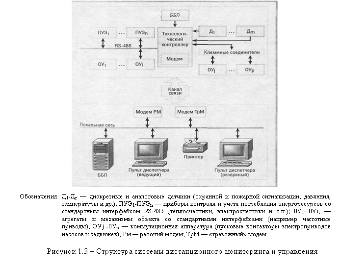 Структура СДМУ, соответствующая выбранной архитектуре, приведена на рисунке 1.3. Аппаратура СДМУ, устанавливаемая непосредственно на объектах, должна обладать возможностью гибкого конфигурировании в зависимости от технических особенностей объекта. Основой такой аппаратуры, как правило, являются технологические контроллеры (ТК). ТК включает в свой состав: