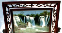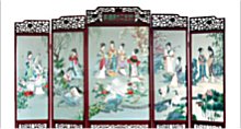 Настольные экраны идеальны для украшения стола. Сюжеты включают пейзажи, цветы, птиц, животных и рыб. Настольные экраны – это двусторонние вышивки тончайшей шелковой нитью на шелковой кисее, помещаемой между двумя стеклами. Вышивка экрана отличается особой кропотливостью работы. Так, вышивальщица использует шелковые нити более двадцати цветов и оттенков для вышивки глаза котенка, а для вышивки хвоста золотой рыбки расщепляет тончайшую нить на 48 практически невидимых волокон. Эти ниточки-паутинки накладываются слой за слоем для достиженния эффекта передачи всех оттенков цвета живого оригинала. Рамка вырезается из ценных пород дерева (красное, палисандр, сандаловое) и по уровню исполнения может рассматриваться как самостоятельное произведение искусства.