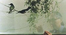 Я уже писала выше, что каждая шелковая нить разделяется на 16 тоненьких ниточек, в зависимости от толщины нити изменяется плотность вышивки. Так, например, основание листа или лепестка вышивается более толстой нитью, а ближе к краям более тонкой, за счет этого создается эффект прозрачности. Важно так-же и направление нити, порой нитью одного цвета можно вышить множество разных оттенков, изменяя направление стежка. Шелк имеет матовый блеск и за счет преломления света дает множество оттенков. Точно так-же и шерсть животных. сначала в основу кладется плотная нить, а потом сверху - более тонкая, имитирующая пух. Самые высокохудожественные работы даже с расстояния двух шагов невозможно отличить от фотографий. В настоящее время мастера чаще всего пользуются готовыми рисунками. т.е на шелке в цвете напечатан рисунок и потом он сверху зашивается шелком, даже если вышивка не очень качественная, на таких работах это не очень заметно. Самые дешевые из них просто прошиваются шелком стежками, даже не закрывая полностью рисунка на ткани. Высшим пилотажем счтается вышивка без рисунка. т.е мастер вышивает по чистому шелку, без рисунка, как-бы рисуя картину нитками. Узелки на нитках не делаются. Каждая новая нитка сначала закрепляется мелкими стежками. а потом это место покрывается вышивкой, конец нити тоже закрепляется мелкими стежками и прячется в уже готовую вышивку. Очень красивы двусторонние картины на прозрачном шелке, когда слевой и справой стороны получается абсолютно одинаковая по аккуратности вышивка. они вставляются в специальные рамки, которые можно поворачивать. Порой бывает. что на одной стороне картинка одного цвета. а на другой - совершенно такая-же. стежок в стежок, но другого цвета. Причем, шелк очень тонкий, неверные стежки делать нельзя, сразу будут видны дырочки от иголок. Да, иголки тоже специальные, кототкие,2.5 сантиметра с маленьким ушком. ткань натягивается на специальную раму, в которой можно менять натяжение, пяльцами не пользуются.