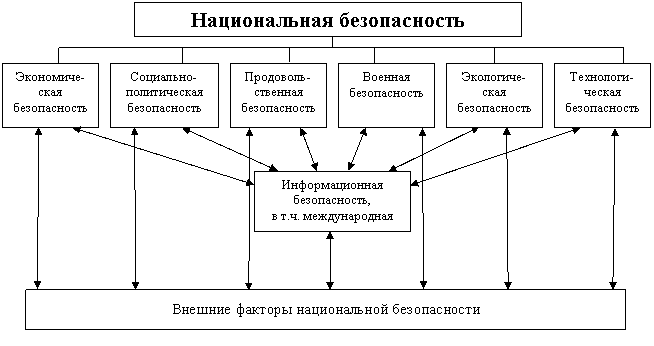 Подчеркивается, что в условиях глобализации значительно повышается роль внешней составляющей национальной безопасности, новых вызовов и угроз, к числу которых относятся риски, связанные со стремительным развитием ИКТ и их радикальным воздействием на все стороны общественной жизни, усилением значимости информационных ресурсов в политике, экономике, конкурентной борьбе. ИКТ становятся важнейшим фактором обеспечения стратегических интересов страны на международной арене. Отсюда – тесная взаимосвязь информационной и иных составляющих национальной безопасности России (схема 1).