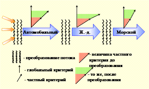 При построении виртуальной системы и «ломаной линии» интегратор должен учитывать критерии работы отдельных перевозчиков. Задачей преобразования потока должно быть и наиболее полное использование функциональных возможностей перевозчиков, и поддержание на должном уровне их локальных критериев (рисунок 4).