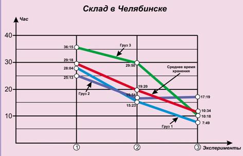 За счет управления снижается среднее время хранения груза на складах (рисунок 16), и существенно снижается требуемая суммарная емкость складов.