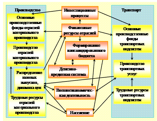 Анализ существующих методик прогнозирования позволяет заключить, что для этой цели наиболее подходит подход, развиваемый Аналитическим центром ВНИИЖТа. Здесь прогноз строится на основе долговременной динамики связей экономического взаимодействия. Объемы перевозок, межрайонные связи, грузовые потоки и их размещение по территории страны служат базой для планирования перспективного развития транспорта. Предлагается программный комплекс, позволяющий моделировать глубокие взаимосвязи в экономике страны, а также связи между экономикой и транспортом. Однако необходимо отображать и динамику внешнего экономического взаимодействия (рисунок 17).