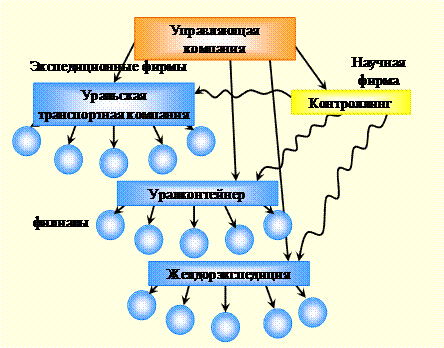 Развитие рынка логистических услуг с необходимостью приводит к появлению холдингов. В холдинг входят самостоятельные специализированные экспедиционные фирмы (forwarding firms – ff), а функцию корпоративного центра берет на себя управляющая компания. Логика создания холдингов следующая.