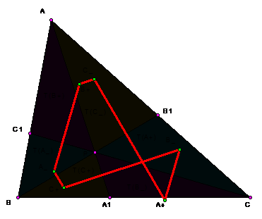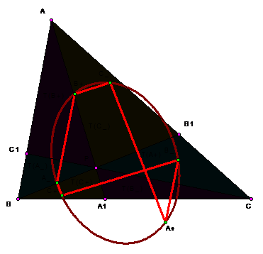 Вершины шестиугольника А+С-В+А-С+В- лежат на одной окружности тогда и только тогда, когда или Р является центроидом G треугольника АВС (и мы имеем в этом случае окружность Ламойена), или же Р совпадает с ортоцентром Н (и в этом случае получается окружность Эйлера).