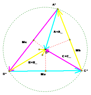 Согласно Утверждению 3, проекции вектора А+А-, отложенного от вершины A* этого треугольника, равны по длине половинам соответствующих сторон. И т. д. – отсюда получаем, что длины этих трех векторов равны радиусу окружности, описанному около треугольника, составленного из медиан. Итак, главные диагонали шестиугольника – параллелограмма оказались равны, и в силу Утверждения 2, около него можно описать окружность.